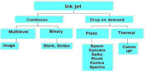 噴墨技術分為連續(xù)噴墨和按需噴墨(DOD)兩種,前者目前只用在柯達的數(shù)字印刷機上,市場上的絕大部分噴墨打印機都屬于按需噴墨技術,按需噴墨又分為壓電和熱發(fā)泡兩類,熱發(fā)泡噴頭廉價、精度高,但其缺點也是顯而易見的:噴頭壽命短、只適用水性墨水,因之主要用于家庭和辦公室的紙張打印;而壓電噴墨是利用陶瓷加上電壓后會變形的原理,直接將電壓轉(zhuǎn)換為機械壓力,工作在常溫下,也無需溶解在水中的氧氣幫忙,所以不但噴頭壽命長,而且可以適用各種類型溶劑所生產(chǎn)的墨水。
