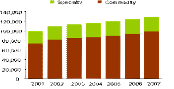 統(tǒng)計數(shù)據(jù)表明,美國家用電腦和打印機的普及培育了桌面噴墨打印的市場,2004年噴墨方式輸出的1160億張打印紙中,特殊打印介質(zhì)將近300億張,預(yù)期2002年至2007年間普通噴墨打印紙和特殊打印介質(zhì)均會有穩(wěn)定增長,這段時間內(nèi),噴墨打印介質(zhì)的打印數(shù)量年度遞增率(CAGR)為3.5%。2004年美國整個噴墨介質(zhì)的收入超過32億美元,其中普通產(chǎn)品約17億美元,透明片或其它膠片薄膜產(chǎn)品0.5219億美元,特殊打印介質(zhì)超過13億美元。雖然普通產(chǎn)品(commodity)仍是噴墨打印的主要輸出對象,數(shù)量上占了總噸數(shù)的75%,但由于價格低,其銷售額只占總銷售額的40%。 2005年預(yù)期桌面噴墨打印的總量將超過1202億張,市場份額33億美元。2002-2007年間預(yù)期噴墨打印紙的銷售額年遞增率2.4%。特殊打印介質(zhì)包括彩噴紙(Coated paper),照片打印紙(Photo paper),明信片紙,背膠,油畫紙,標(biāo)簽紙等等。在特殊打印介質(zhì)的增長中,彩噴紙的增長速度相比較慢,而照片打印紙增長速度很快,預(yù)計2002-2007年間照片打印紙的年遞增率將高達16%!這種增長歸功于低價位數(shù)碼相機的熱銷;低于50美元打印機的銷售;和數(shù)字圖像傳輸?shù)目旖菪浴?/span>