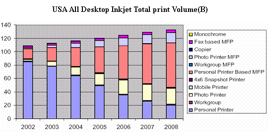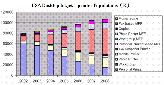 2004年11月15日InfoTrends研究機構(gòu)發(fā)表的市場調(diào)查結(jié)果表明,2003年美國共安裝了超過8300萬臺桌面噴墨打印設(shè)備,使得噴墨成為桌面打印的主要輸出方式。其中,照片噴墨打印機裝機量482萬臺,比02年增加39%。在這里所謂照片打印機(Photo Printer),是指同時具備照片級彩色輸出性能,數(shù)碼相機存儲卡插槽,照片級墨盒三種典型特征的打印機。多功能一體機(MFP, multifunctional printers or imaging devices)是將打印,掃描,傳真,復(fù)印等功能復(fù)合一體的設(shè)備,其增長的速度也非???,2003年裝機量1585萬臺,比02年的1085萬臺增長46%。其中部分MFP除打印,掃描,傳真功能外,還具備照片彩色打印功能,這種增長同時也大大提高了特殊打印介質(zhì)(specialty media)的需求。Infotrends預(yù)期到08年,照片噴墨打印機的年裝機量可達1890萬臺,占總裝機量的18%,普通MFP高達4800萬臺,占總裝機量的45%,帶照片彩色打印功能的MFP1160萬臺,占總裝機量的11%。而普通型個人噴墨打印機(Personal Pinter)的裝機量呈逐年下降趨勢,數(shù)據(jù)表明2003年比02年下降了4.3%,普通個人噴墨打印機所占比例也逐年減少,預(yù)期08年僅占15%以下。2003-2008年間,噴墨打印機的總裝機量CAGR 為5%。
