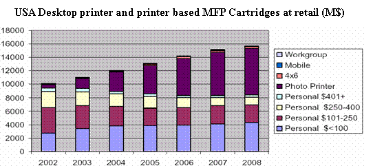 從全美零售市場的數(shù)據(jù)分析, 2003-2008年噴墨墨盒的零售總額年遞增率約8%,其中照片質(zhì)量墨盒的銷售量呈增長勢頭強勁。由于照片噴墨打印機和具備照片彩色打印的MFP可能使用同一型號墨盒,統(tǒng)計將兩者合并。普通噴墨MFP也和對應(yīng)的普通個人型打印機合并。數(shù)據(jù)顯示,2003年用于照片打印的墨盒零售總額19.10億美元,占全年零售總額(107.2億美元)的17.8%, 比02年的6.90億美元增加了177%。2008年, 預(yù)期用于照片打印的墨盒零售總額可達73.10億美元。對于普通的中高端墨盒零售額,由于受到價格下降和激光打印輸出方式的影響,03年到05年間有明顯下降,05年至08年基本保持不變。而低端的噴墨墨盒一直穩(wěn)中有升。