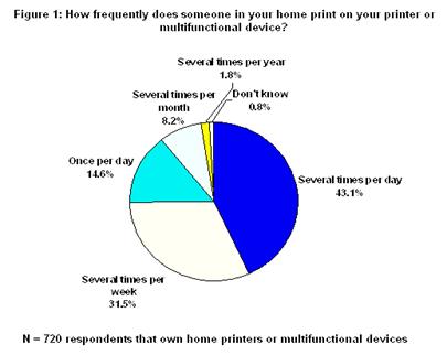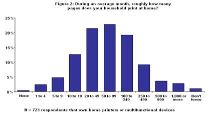 2003年8月CAP Ventures 通過對全美網(wǎng)上擁有家庭打印機的用戶進行打印習(xí)慣調(diào)查,共有超過700名用戶參與調(diào)查并做有效回答,用戶使用打印機的頻率和打印張數(shù)下圖所示: