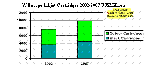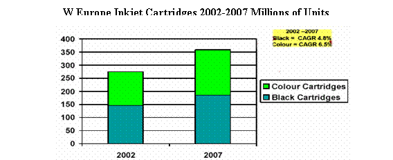 CAP Ventures 2003年對西歐市場的調(diào)查結(jié)果顯示,2002-2007年間,預(yù)期彩色噴墨墨盒的銷售數(shù)量年遞增率將達6.5%, 從2002年的1.26億個增加到2007年的1.72億個。而黑墨墨盒的年遞增率4.8%, 略低于彩墨增長率。銷售額的年遞增率則為黑墨 4.1%,彩墨5.7%。2002年彩墨墨盒的銷售額約40億美元,2007年可望達到52億美元。