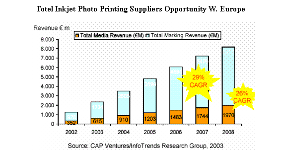 耗材方面2003年西歐市場照片噴墨打印介質(zhì)的收入為6.15億歐元,而整個照片打印介質(zhì)加墨水的收入為17.13億歐元。 2008年照片打印介質(zhì)收入預(yù)期可達19.70億,CAGR高達26%。照片介質(zhì)加墨水銷售收入可望達62.05億歐元,CAGR29%。