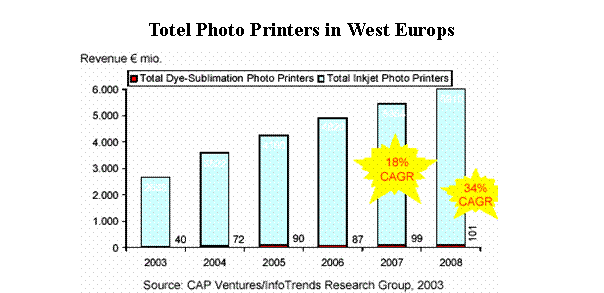 Infotrends /CAP Ventures 2004年2月的調(diào)查顯示, 2003年整個西歐照片噴墨打印機的市場銷售額為26.33億歐元,而熱升華打印機的銷售額僅0.40億歐元,2008年照片噴墨打印機的市場銷售額可望達到59.10億歐元,每年遞增率18%,熱升華1.01億歐元,由于基數(shù)小每年遞增率達34%。