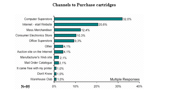 調(diào)查機構(gòu)發(fā)現(xiàn):用戶購買照片墨水和介質(zhì)的渠道有較大區(qū)別,雖然電腦超市都是用戶最常去的場所,但墨水的銷售很多是通過Internet和大型超市實現(xiàn)的,而介質(zhì)通過Internet網(wǎng)的銷售方式僅排第5位,大量用戶選擇在大型超市、辦公品商場購買。用戶選擇在辦公品商場購買墨水的比例僅占9.3%。上述區(qū)別的原因可能是:用戶對墨水品質(zhì)保證的關(guān)注程度高于介質(zhì),顯而易見相比于介質(zhì),墨水對打印機可能能造成更大的傷害。