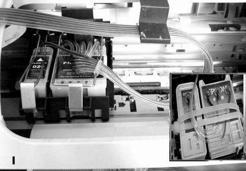內(nèi)墨盒上面插有排管,這樣就造成原有墨車(chē)蓋子無(wú)法蓋上,最早的辦法是將墨盒捆扎在墨車(chē)上,或者將墨車(chē)蓋子取下用鐵絲制作的架子代替,以便固定內(nèi)墨盒(圖6)。而目前有幾個(gè)比較好的辦法: