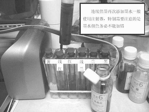 2.我們對(duì)連續(xù)供墨應(yīng)有一個(gè)辯證的認(rèn)識(shí)。①連續(xù)供墨系統(tǒng)本身不是一個(gè)有獨(dú)立功能的產(chǎn)品,它必須得安裝在打印機(jī)上才能發(fā)揮其作用,打印機(jī)也不會(huì)因?yàn)榘惭b了連續(xù)供墨而性能更好、打印精度更高。②目前,打印機(jī)更新?lián)Q代也快,型號(hào)也多,所以目前連續(xù)供墨還是手工作坊式的組裝,在接頭、插件等部位難免會(huì)有疏漏,造成裝有墨水的連續(xù)供墨產(chǎn)品在長(zhǎng)途運(yùn)輸后的銷(xiāo)售中,一次開(kāi)箱的產(chǎn)品合格率相對(duì)不高;③連續(xù)供墨的套件從自身上講并不是十全十美了,還有一個(gè)不斷改進(jìn)、不斷適應(yīng)的過(guò)程;④如果說(shuō)使用原裝墨盒就不會(huì)出現(xiàn)問(wèn)題,那打印機(jī)廠家為何還要那么多的維修中心?使用連續(xù)供墨后,還是會(huì)出現(xiàn)一些新的情況,在處理一些問(wèn)題時(shí)會(huì)增大處理上的難度,比如,使用中打印機(jī)卡紙,原來(lái)可以打開(kāi)面蓋慢慢地將紙張拉出來(lái),但是連續(xù)供墨后上面有排管橫穿,紙張拉出過(guò)程中就更要小心。⑤打印量本身就少,比如兩個(gè)月使用不完一套墨盒的用戶不提倡使用連續(xù)供墨系統(tǒng),可以采用無(wú)綿填充墨盒手工加墨(圖9)。