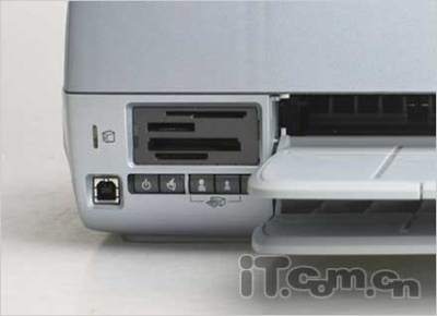 對于照片打印機(jī)來說,最重要就是它一般都設(shè)計(jì)內(nèi)置了數(shù)據(jù)讀卡單元,能夠在不連接計(jì)算機(jī)的情況下,可直接讀取數(shù)碼相機(jī)存儲(chǔ)卡中的照片數(shù)據(jù)并進(jìn)行打印。可以從圖中看到,在Photosmart 7268前面板上提供的一組存儲(chǔ)卡插槽,這一組存儲(chǔ)卡插槽,能夠直接讀取CompactFlash、SmartMedia、Secure Digital、多媒體卡以及記憶棒等主流類型的存儲(chǔ)介質(zhì)。另外在插槽旁邊也提供了提供了打印10×15cm照片和打印照片拼頁的按鍵,接讀取數(shù)碼相機(jī)存儲(chǔ)卡中的照片數(shù)據(jù)并進(jìn)行打印。